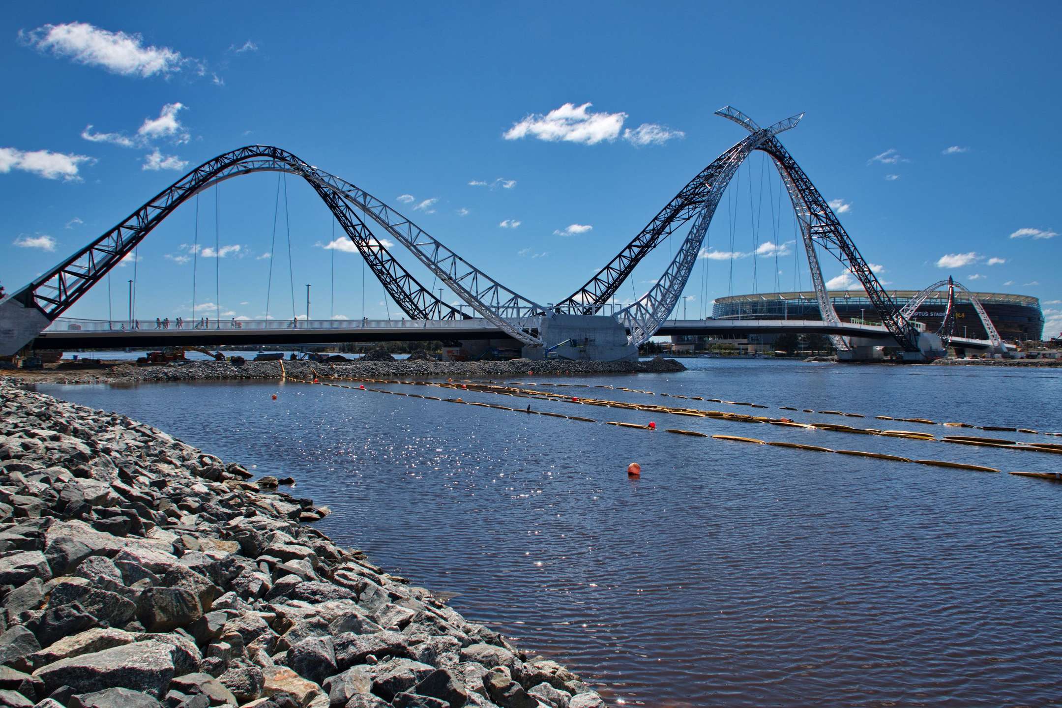 The Matagarup Bridge connecting Optus Stadium and the Burswood Peninsula to East Perth was constructed by York Civil/https://www. Rizzani de Eccher joint venture and was opened to the public in 2018.The 370 meters long bridge is not just a pedestrian bridge but offers much more to visitors.